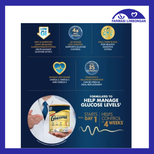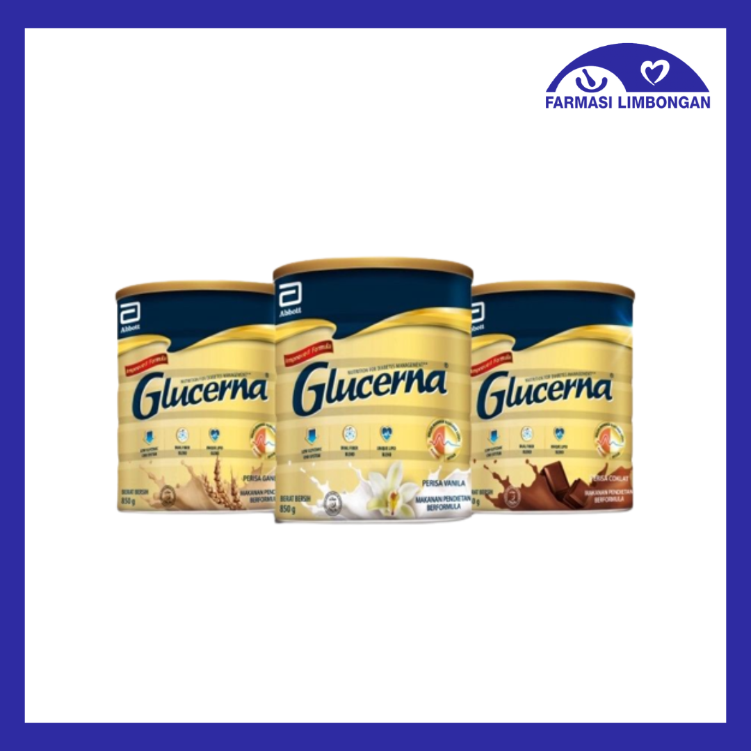 GLUCERNA®UsageGLUCERNA® is a complete and balanced product to help diabetics achieve steady release for proven blood glucose control.The Science Behind Glucerna® Glucerna®’s product advantages come from its low GQ, high fibre and MUFA. Low GI foods help keep blood sugar levels under better control and decrease the need for insulin. Slow digested carbohydrate (fibresol + sucromalt) results in slow release of blood glucose providing better glycaemic response.3 Glucerna® contains higher fibre* to increase satietyGLUCERNA® is a complete and balanced meal replacement product to help diabetics manage their weight. GLUCERNA® contains higher fibre* to increase satiety.Glucerna® contains higher MUFA* A diet high in MUFA, omega-6, omega-3 and low in Saturated Fatty Acids (SFA) are associated with a reduced risk of cardiovascular disease (CVD)4.Take Glucerna® daily as part of diabetes nutrition management plan.