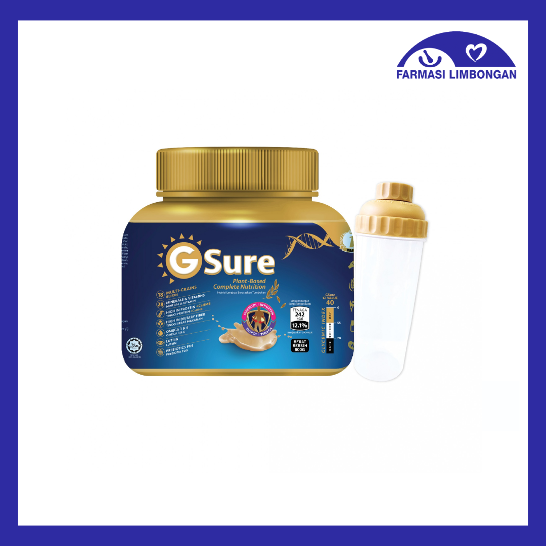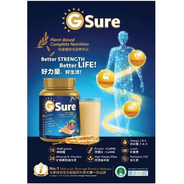 GSure is a plant-based complete and balanced nutrition beverage. It is specially formulated with 18 types of premium grains and added with 28 types of essential vitamins and minerals, CaHMB, Omega 3 & 6, Prebiotics and Lutein.