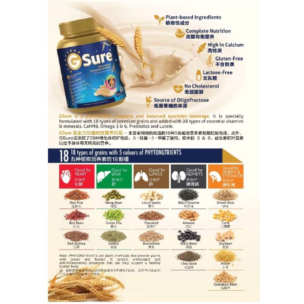 GSure是全方位植物性营养饮料。主要采用精挑细选的18种5色植物营养素榖糧配制而成。此外,GSure还添加了28种维他命和矿物质,β-羟基-β-甲基丁酸,欧米伽 3 & 6,益生素和叶黄素以给予身体每天所需的营养。